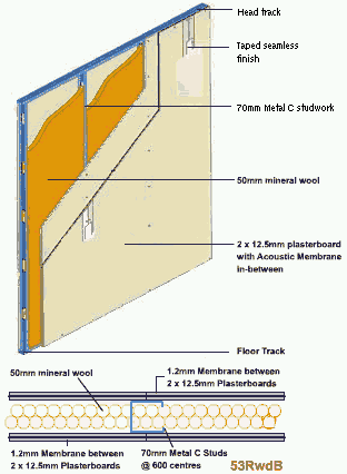 1 x 1.2mm Acoustic Membrane between 2 x 12.5mm Plasterboard (screwed to studs)