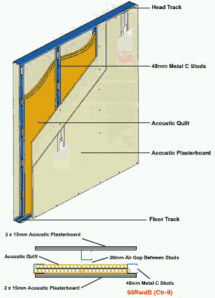 2 x 15mm Acoustic Plasterboard (screwed through to studs)